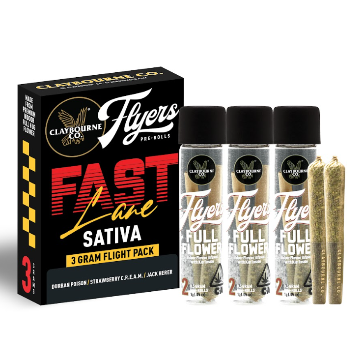 Turbocharge your day with a Flyers Fast Lane Flight Pack. This sativa flight includes three (3) different strains in a box and two (2) half gram pre-polls for every strain, made from premium indoor full nug flower. Try a variety of three different energizing sativa strains.
