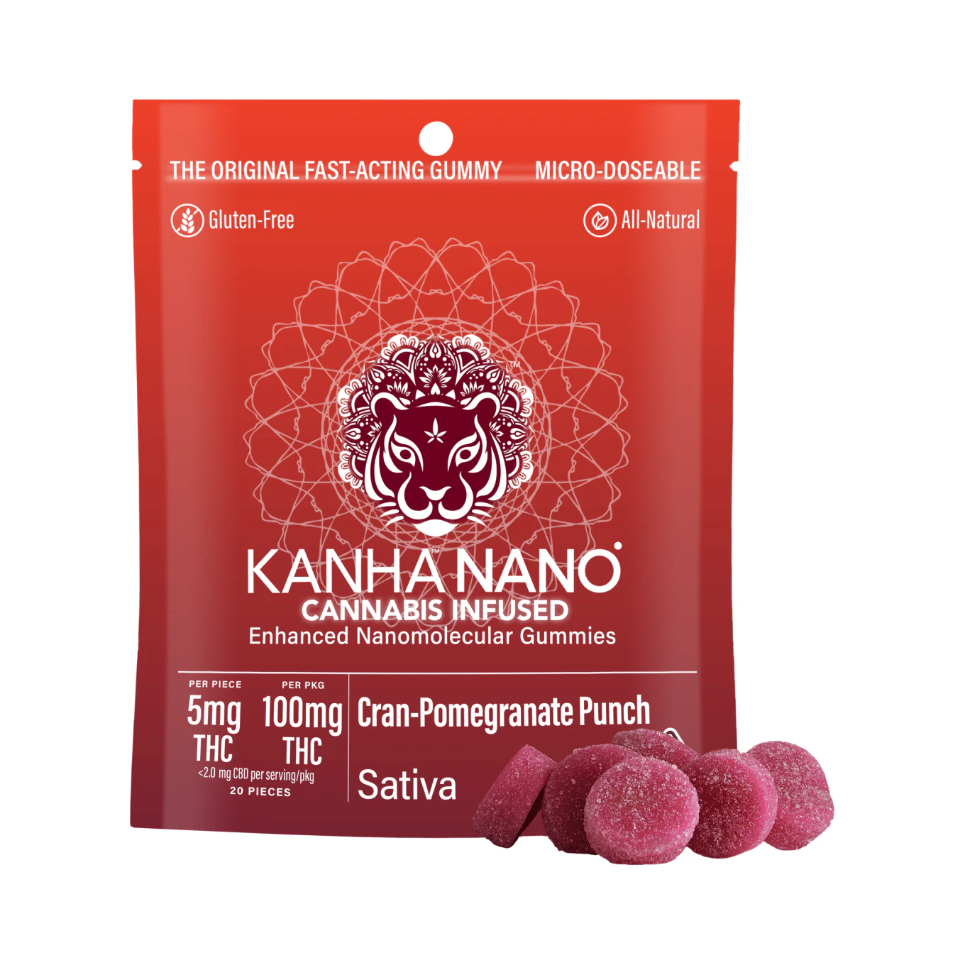 Old world meets new when cranberries, one of North America's few native fruits, meets pomegranates, a Mediterranean berry dating back to ancient times, for a sweet Cran-Pomegranate Punch. Made with the finest sativa oil and aromatic terpenes, these gummies enjoy better absorption and rapid effects thanks to our exclusive NANO technology for reducing cannabinoid sizes. Sold in packages of 20, each gummy contains 5mg of THC, an ideal amount for microdosing or customizing your experience. KANHA, the first brand to introduce fast-acting effects, remains the best with NANO gummies.