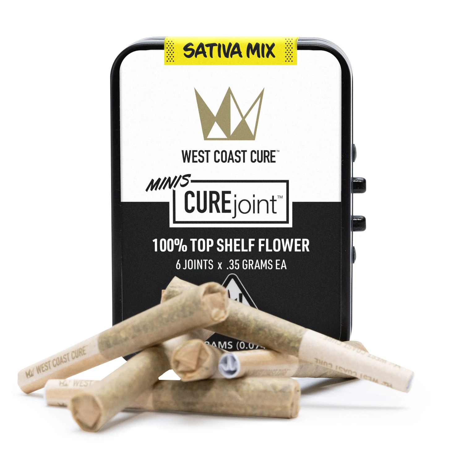 Sativa Mix .35g mini pre-rolls by West Coast Cure contain 6 personal-sized joints. Rolled from the same de-stemmed, 100% top-shelf flower utilized in WCCs full-sized CUREjoints, theyre perfect for single-use sharing or that solo smoke session. A thoughtful and covid compliant pre-roll, the flower used is a blend of several of our favorite Sativa strains. Making for an uplifting and cerebral high that motivates the senses, these minis are a great choice for the Sativa lover.