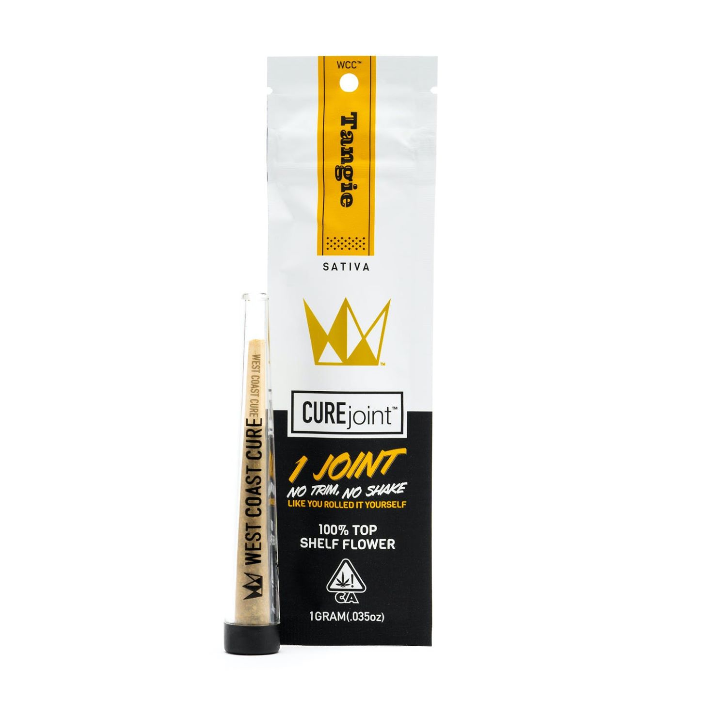 The Tangie CUREjoint from West Coast Cure expresses a sativa phenotype and packs a toothsome flavor. A hybridized cross between an old school Skunk and California Orange, the joint radiates a fragrant citrus aroma that dominates the palate, electrifies the taste buds and energizes the mind. Typically testing in the mid 20-percentile for THC, this cultivar provides a focused mindset with creative tendencies. And when lit, ripped and inhaled, the joints psychoactive compounds provide a tropical treat for the senses. WCCs Tangie CUREjoint is loaded with sweet and citrusy terps that are physically uplifting and mentally stimulating. A thought-provoking smoke with a delicious kick, The Tangie Cured Joint from West Coast Cure is a well balanced strain that works nicely morning, noon, or night.