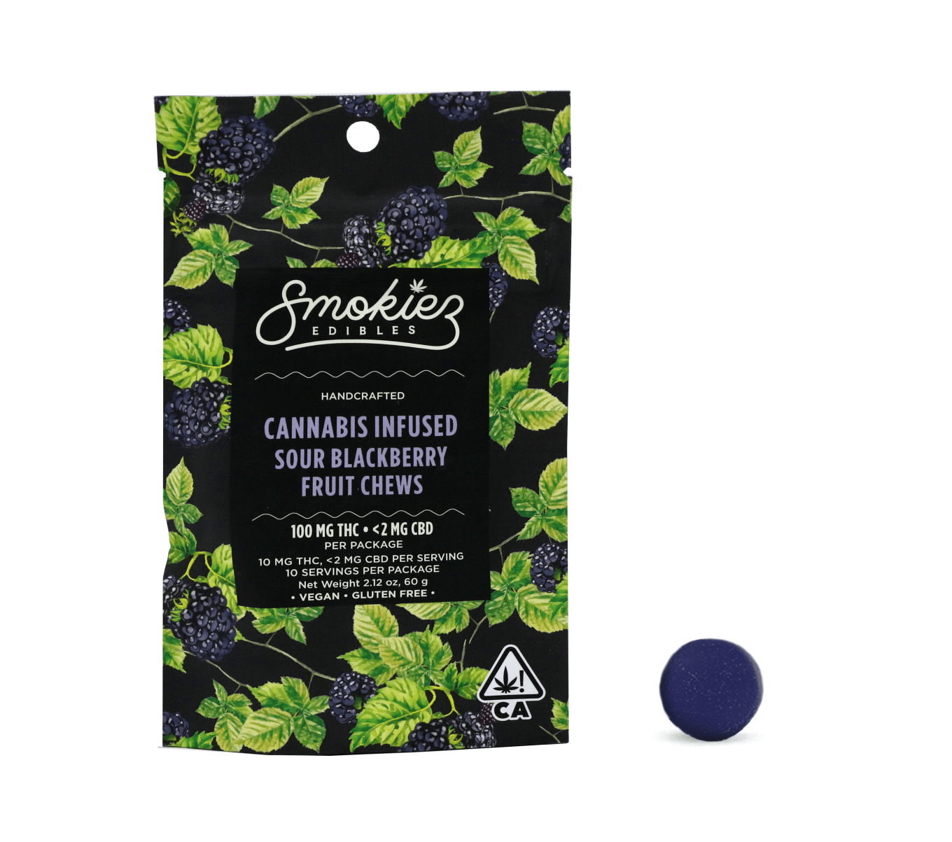 Smokiez Sour Blackberry Fruit Chews are NOT YOUR AVERAGE GUMMY. These delicious fruit chews are a tasty and satisfying way to medicate. Each mouth watering fruit chew is made with high clarity cannabis distillate for great taste. Smokiez gummies are vegan, gluten free, dairy-free, and contain NO high fructose corn syrup.Dosage: 10mg THC/<2mg CBD per gummySize: 10 gummies per package (100mg THC total)
