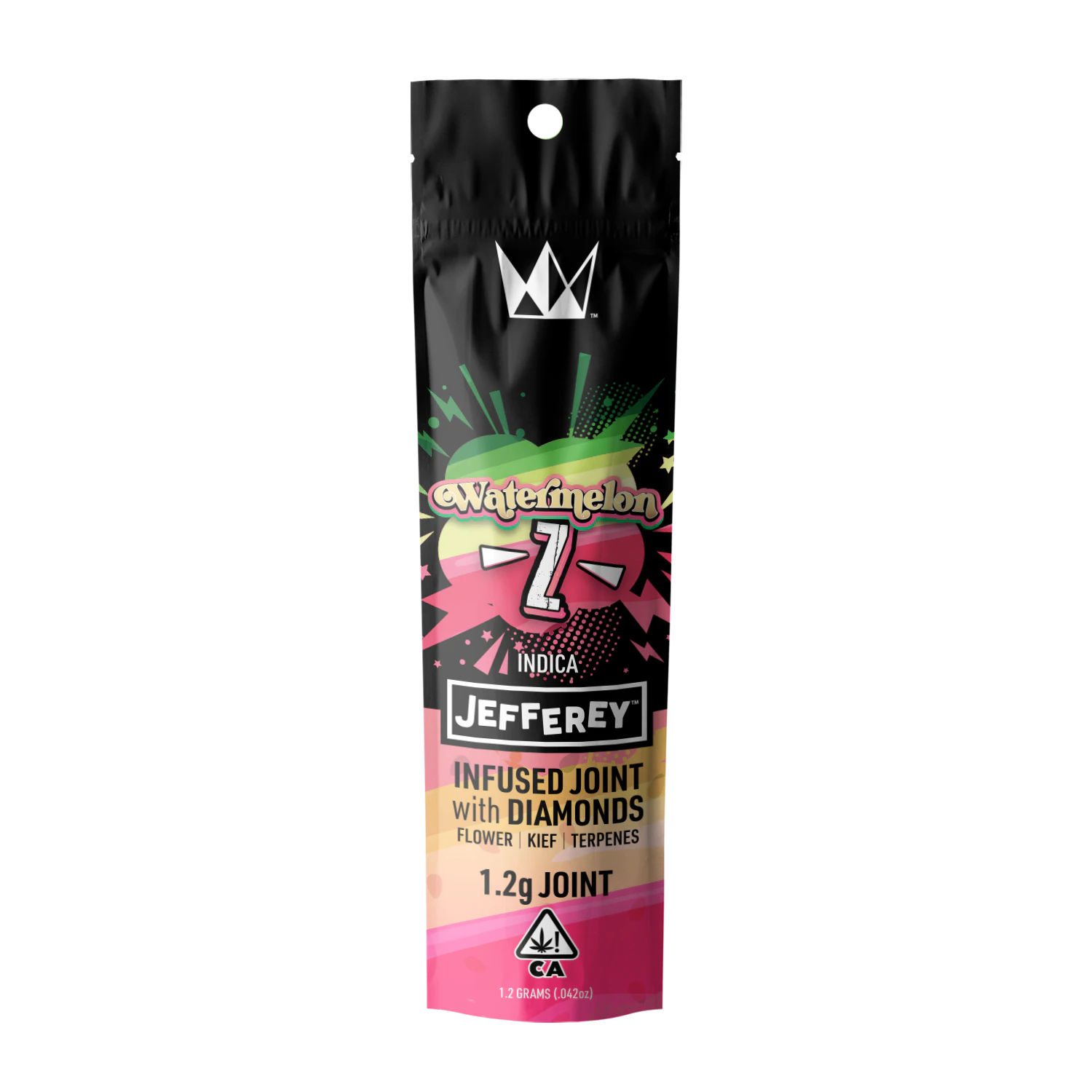 Watermelon Z Jeffrey Single – indulge in the delightful fusion of flavors. Crafted from our whole nug buds, these .1.2g joints boast a bouquet of sweet berries and tropical notes. Infused with potent THCa diamonds and enriched with kief from our Top Shelf Flower, each joint creates a relaxed vibe-shift. Subtle. Satisfying. Harmonious.