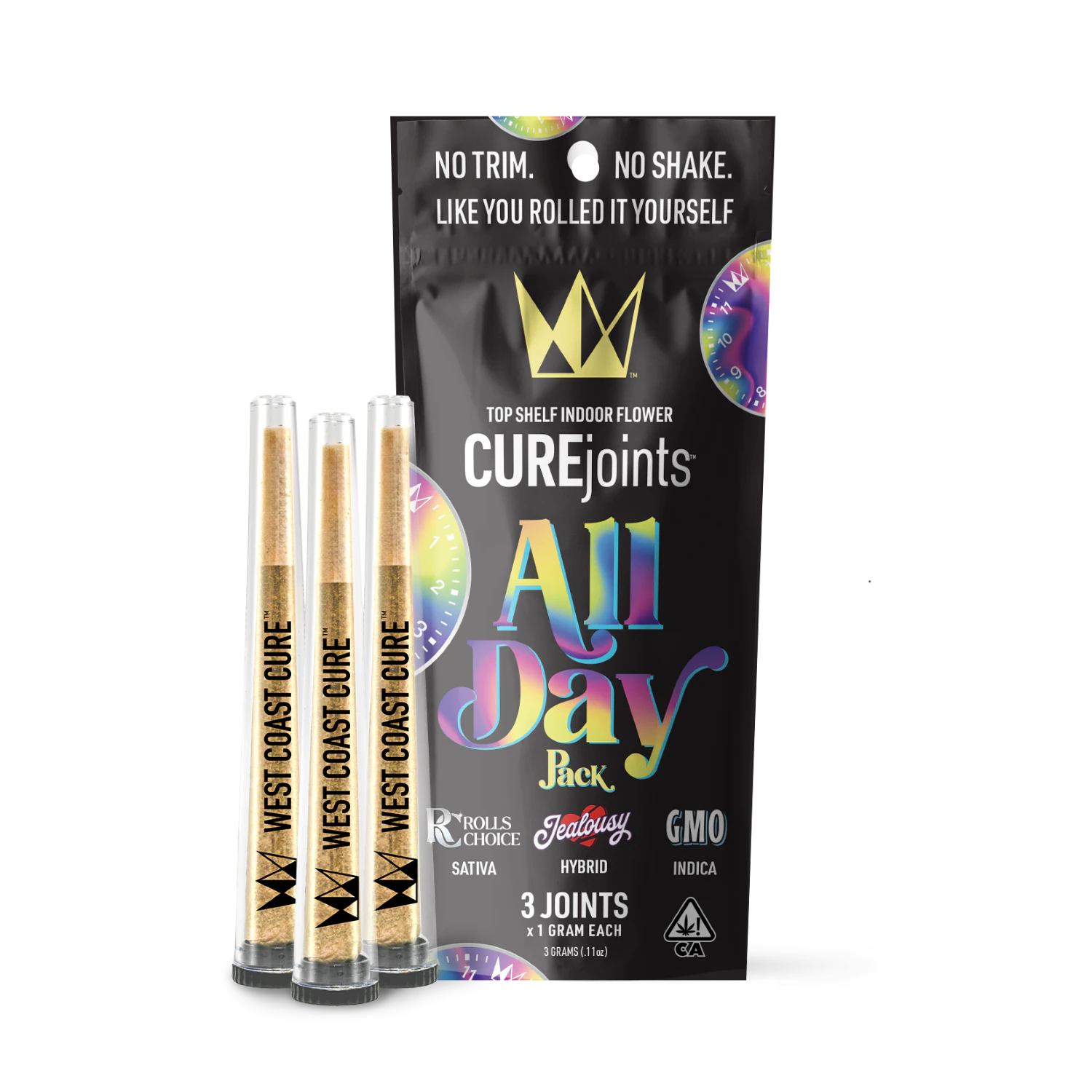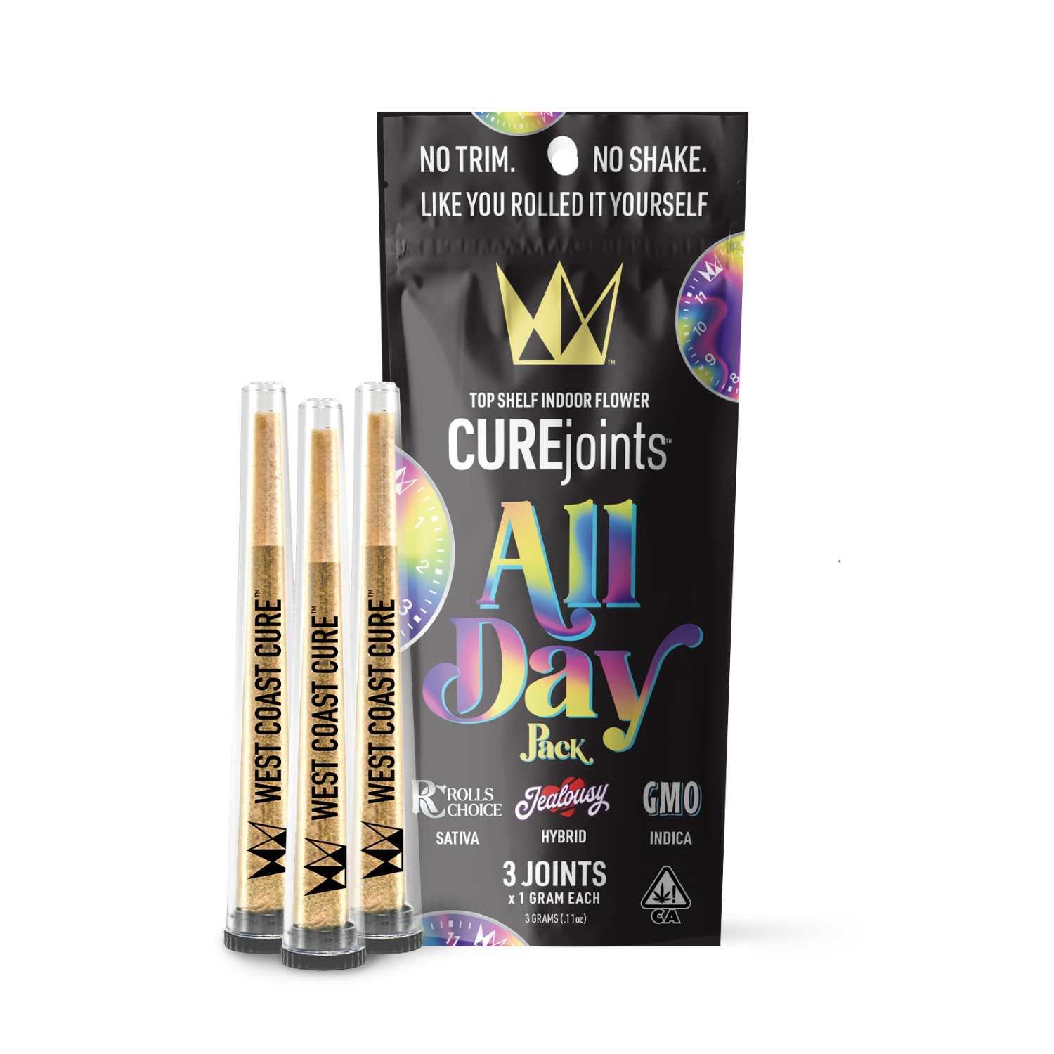 The All Day variety pack is your VIP pass to a full day of premium vibes. Kick things off with Rolls Choice (Sativa) for that early morning rocket fuel, slide into Jealousy (Hybrid) for a smooth midday cruise, and when the sun sets, let GMO (Indica) tuck you in for a chill night. Every joint’s packed with WCC’s finest, so you’re getting that top-shelf flavor and effect every time. Whether you’re looking to rise, ride, or relax—this pack’s got your whole day on lock. Go ahead, treat yourself like a boss!
